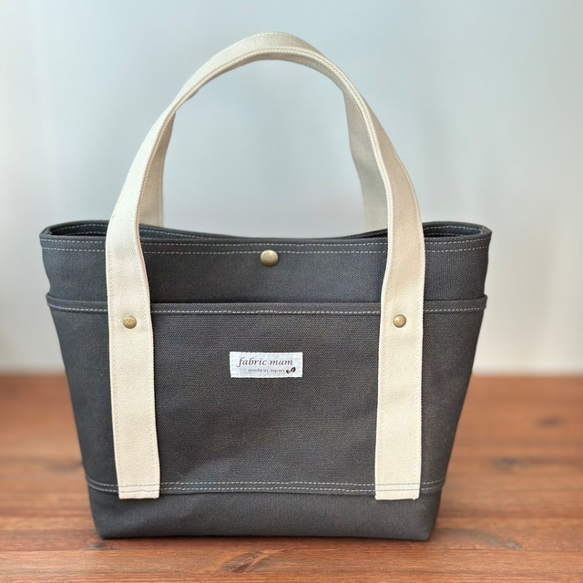 ▢軽量で丈夫な倉敷帆布素材を使用した可愛らしいSサイズトートバッグ。落ち着いたチャコール色ベースに持ち手の軽やかな生成り色がおしゃれで目を引きます。 ▢このしっかり帆布トートは、コンパクトながらも収納力抜群。身の回りのお荷物を持ち運ぶ際に最適なサイズで、普段着の外出やお友達との会食などのお供にピッタリです。長財布が余裕で横に入ります。 ▢このトートを手にすれば、心も軽やかになれることでしょう。日常をちょっとだけ特別に彩るアイテムとして、是非お試しいただきたい逸品です。大人可愛くお持ちいただけます。 ▢内布は11号帆布の生成り色、内ポケット一つお付けしました。お荷物を入れなくても自立します。開閉部にはジャンバーホックをお付けしました。 ▢サイズ 横 35cm ※注 高さ 22cm マチ幅 10cm 外ポケット 幅いっぱい、前後、高さ14cm 前は仕切りなし、後ろは中央仕切り付き ※注: 明記してあります長さは画像9枚目の①の長さです。(イメージ画像で、実際の商品とは異なります)画像中-------の長さは4-5cmほど狭くなります。これは当店で使用している帆布がとてもしっかりとしていてサイド部分にカーブができるため、内寸に誤差が生じるためです。 ▢こちらの商品は1点のみ在庫がございます。1両日中に発送が可能な商品です。 (土日祝を除く) ▢お色を選べる商品ではございません。在庫限りとなります、ご了承ください。 [✤オプションあり✤] 下記のオプションに対応しています。オプションご希望の場合はご注文の際に必ず下のオプション欄をご確認・ご選択の上ご注文いただきますようお願いいたします。 (ご注文完了後のオプション追加はシステム上できかねます、ご了承ください) ✤プレゼント用ラッピング可能です。 何かございましたらお気軽にお問い合わせください。 ※商品の色味は、ご使用のモニター環境により実物と異なって見える場合がございます。ご了承ください。