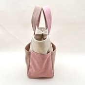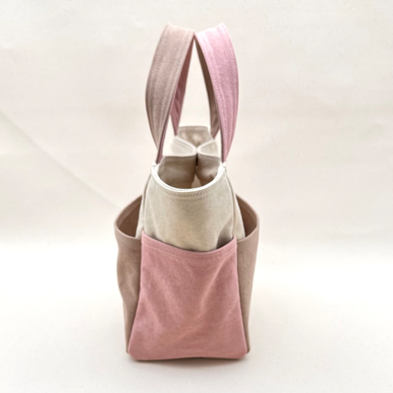 ◇バイオウォッシュ帆布を使用したマチ広で、前後・左右ぐるっと1周外ポケットをお付けしたトートバッグです。ベースにアイボリー色、外ポケットの前後にライトシナモン色、両サイドにスモーキーコーラル色を添えてふんわり優しく仕立てました。