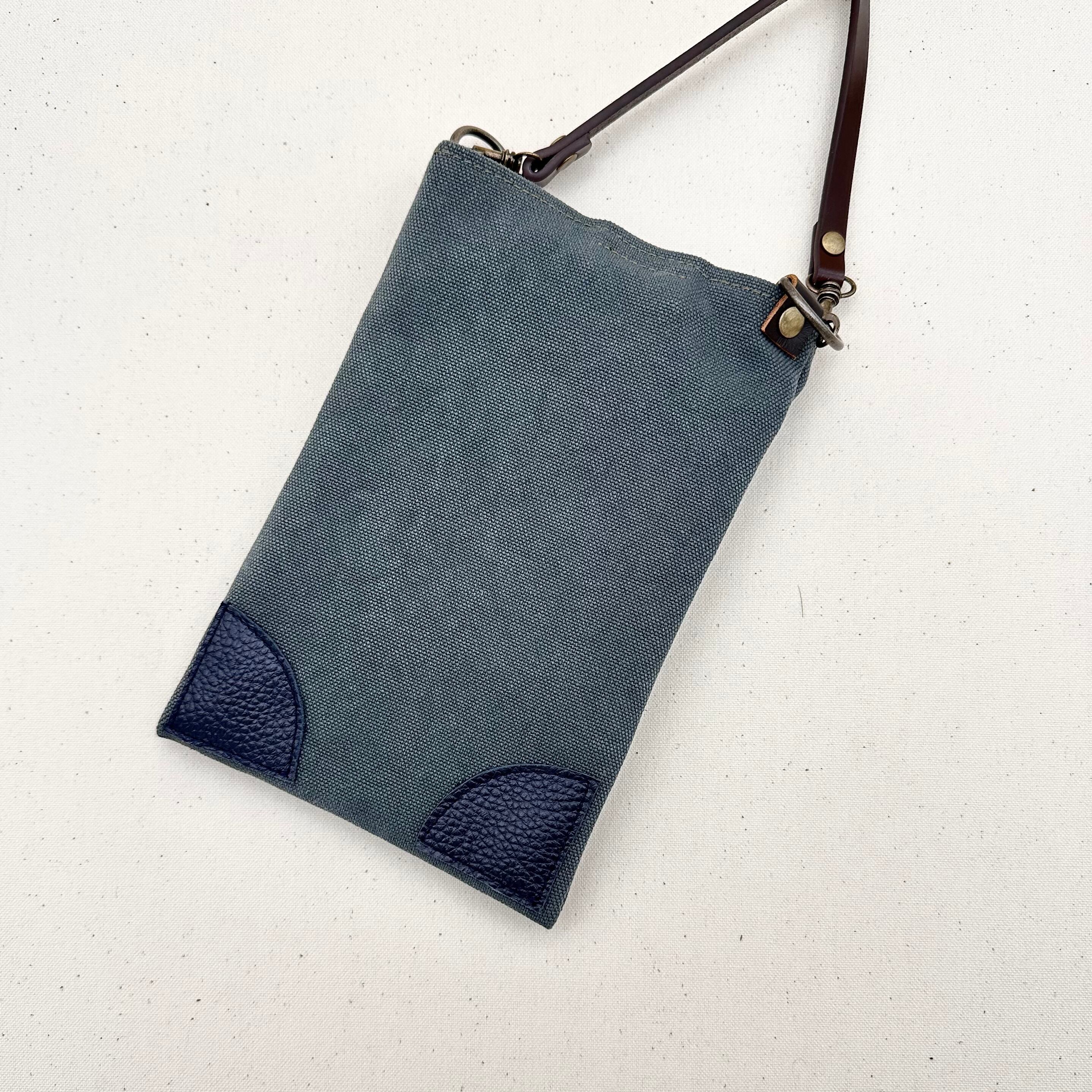 ▢丈夫で使いやすいスマホポシェットが登場!本体と外ポケットともにバイオウォッシュタイプの8号倉敷帆布を使用し、本革をあしらいました。