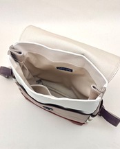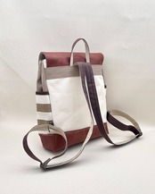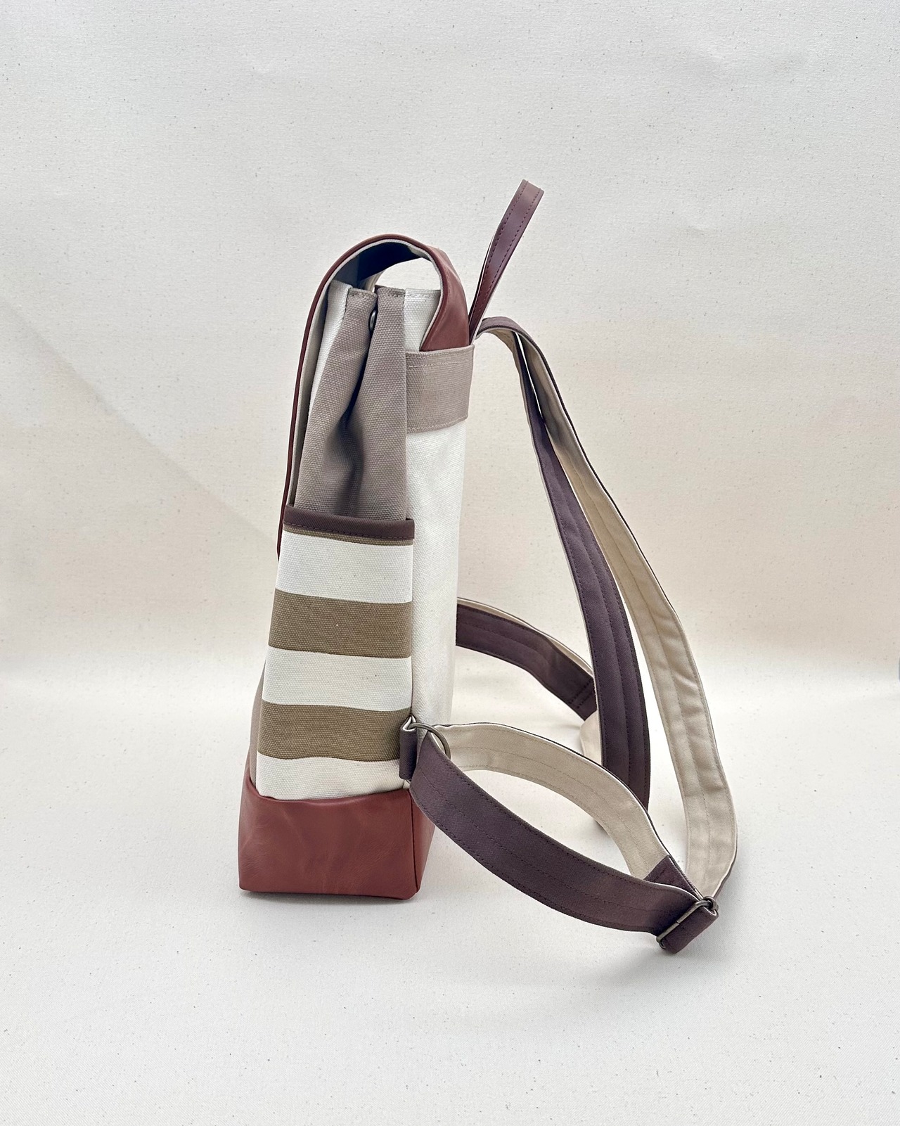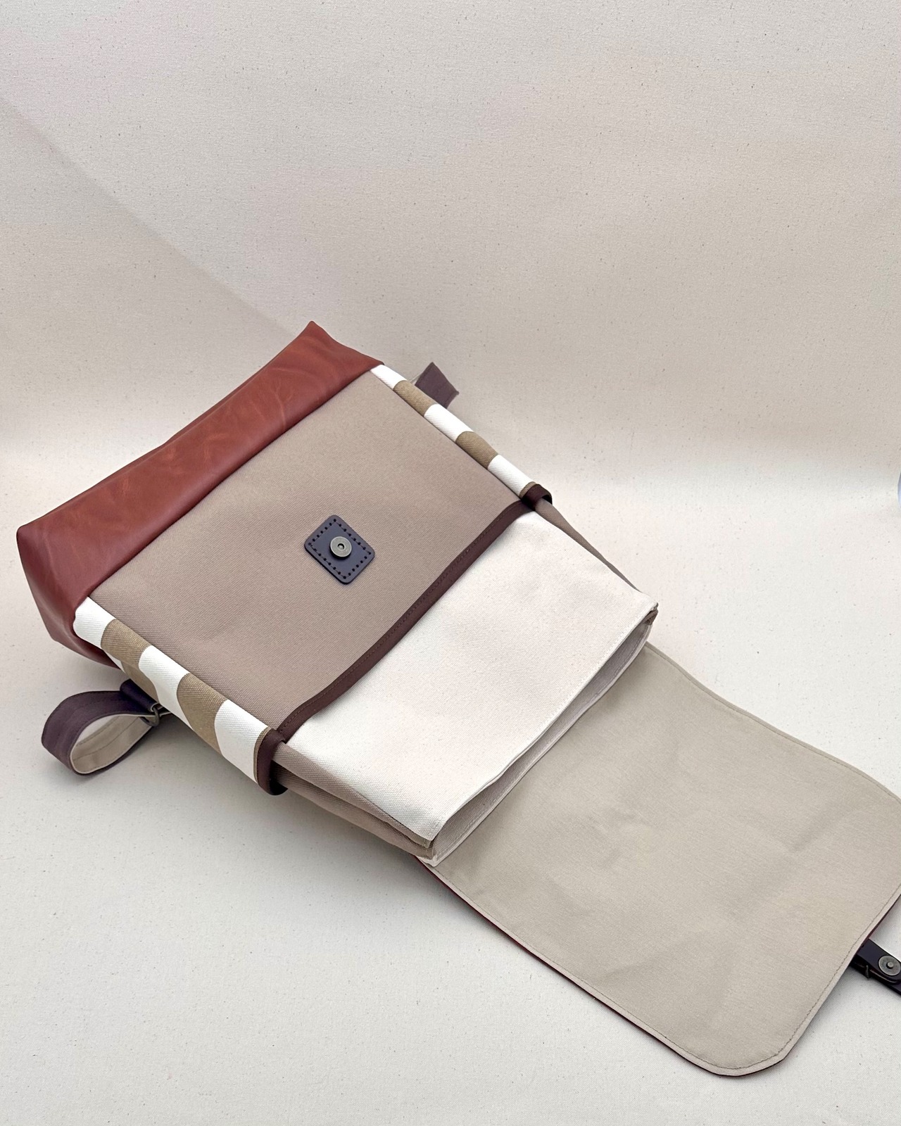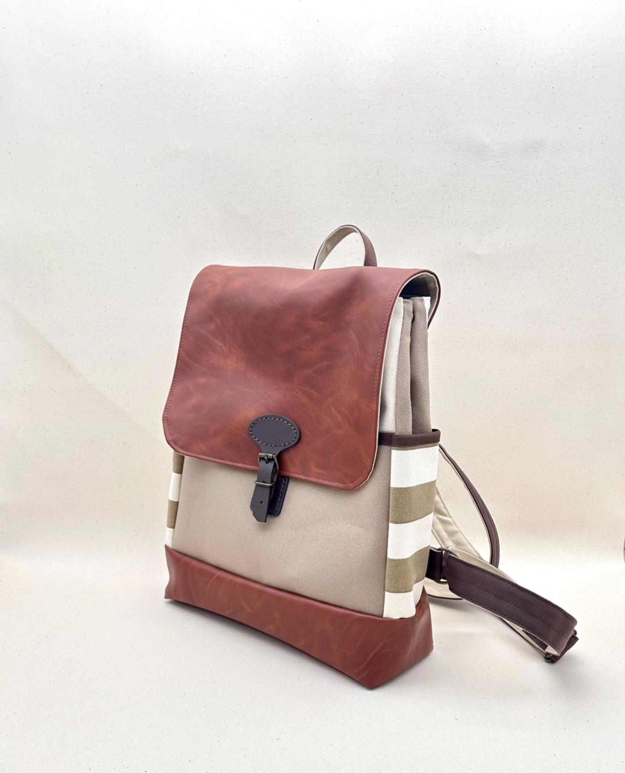 ▢生成色の8号帆布をベースに、前ポケット部分にマッシュルーム色を、サイドポケット部分にベージュボーダーを、ふた部分と底・下部分に合皮を使った大人リュックです。合皮は濃いキャメル色系のお色です。