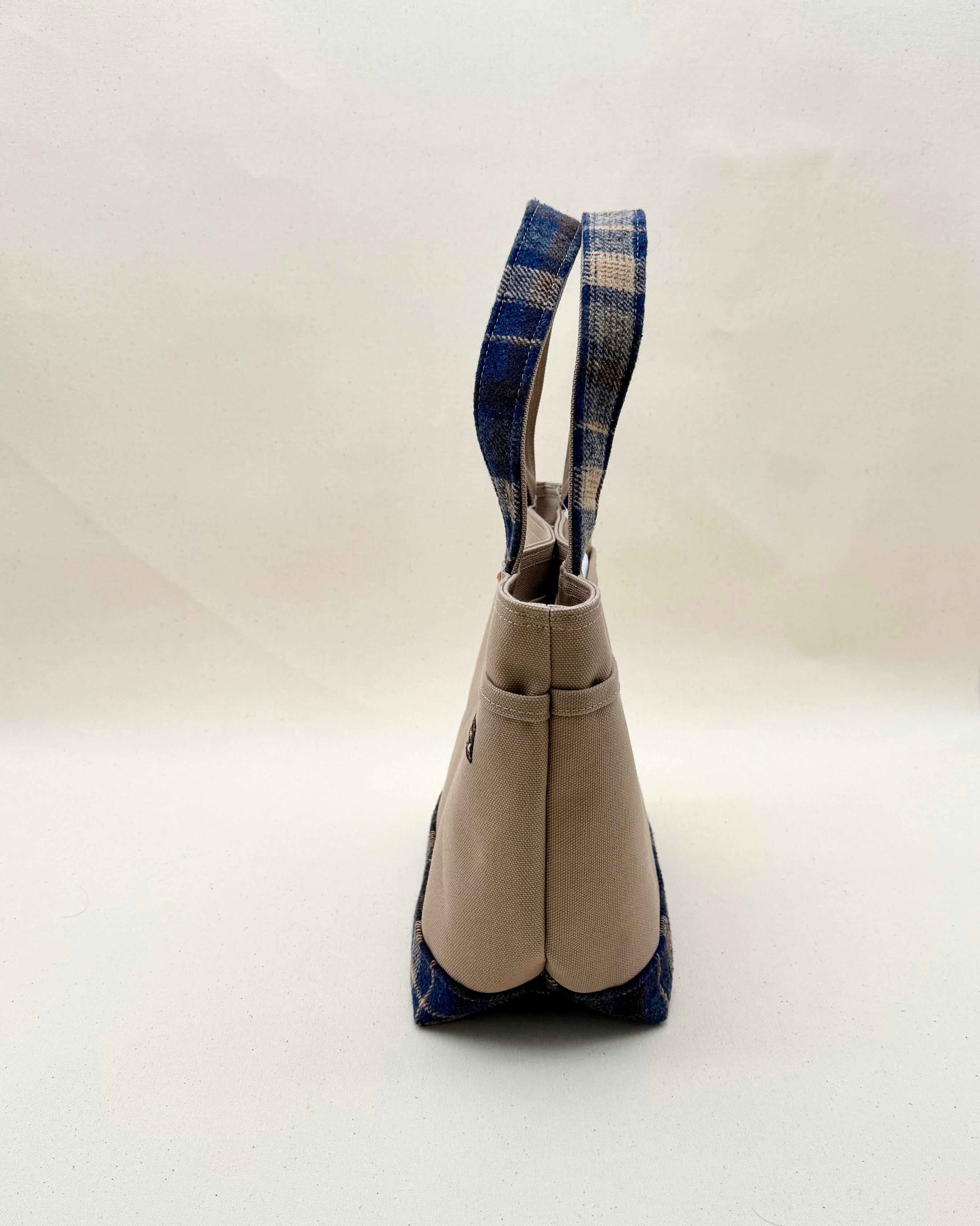 底と持ち手に**ウール混素材(ネイビー系チェック)**を合わせて、