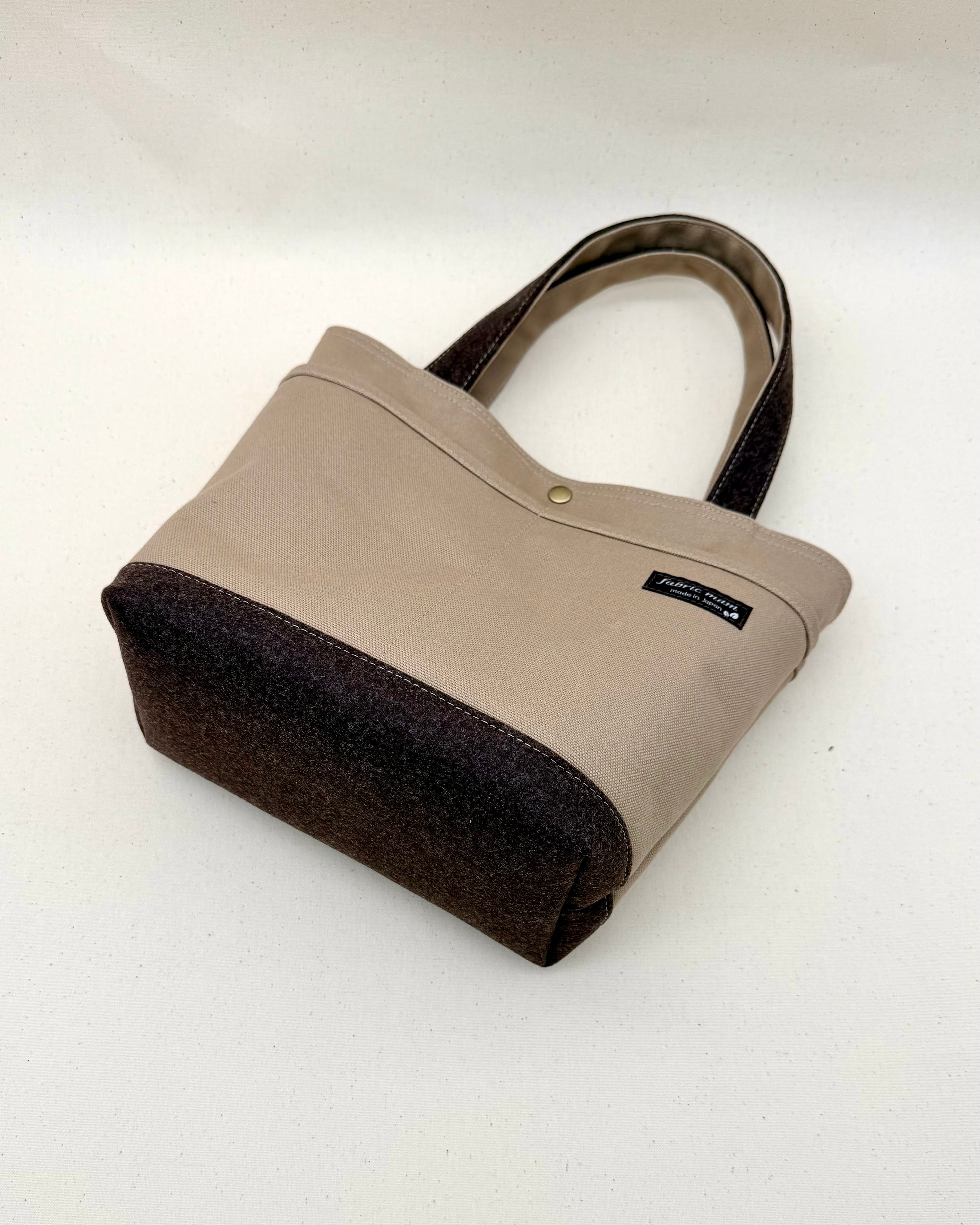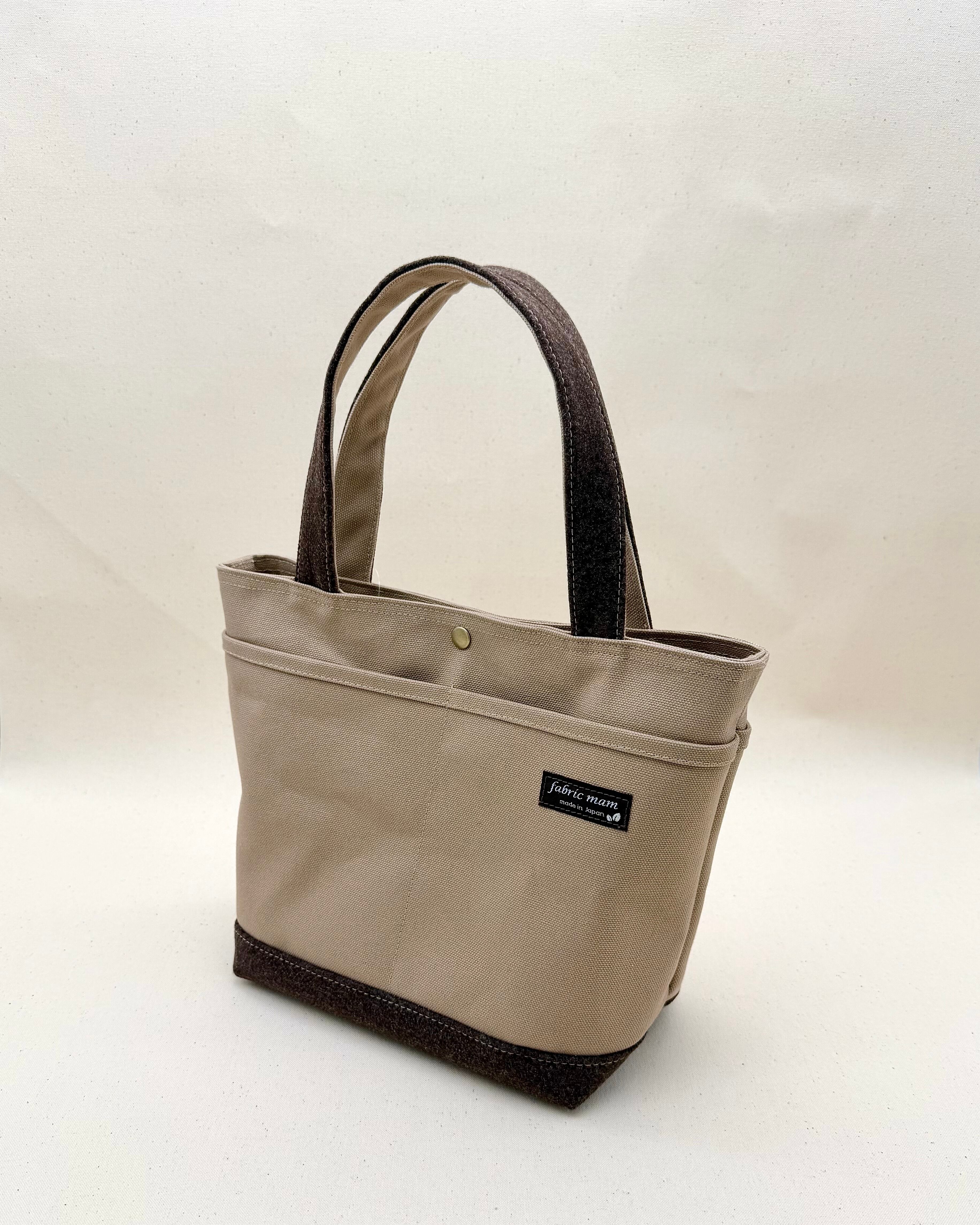 ◻︎ マッシュルーム色の倉敷帆布に、ブラウン系フェルト生地を合わせたシンプルだけれども冬らしさのあるSサイズバッグ。上品な”ぬくもり”を添えて。