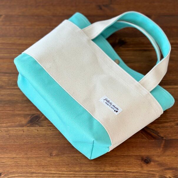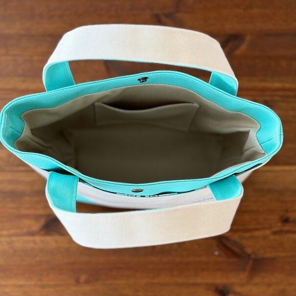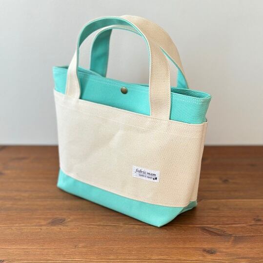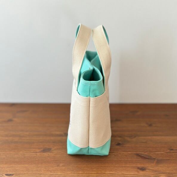 かっちりタイプのホライズン色(090)8号帆布を本体に、生成り色8号帆布を外ポケットともち手部分に使用したトートバッグです。