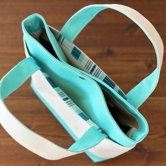 ▢一見シンプルな帆布トートバッグ、よく見るとちらりとあしらったマルチボーダーや外ポケットのつけ方など、他の人とはかぶらないこだわりのある一品です♪