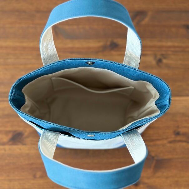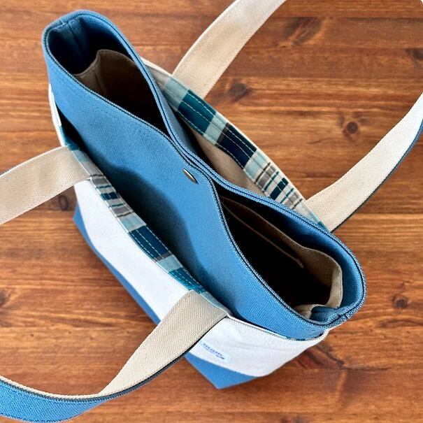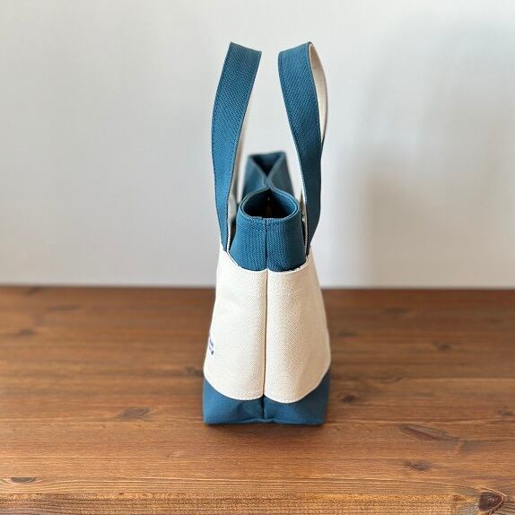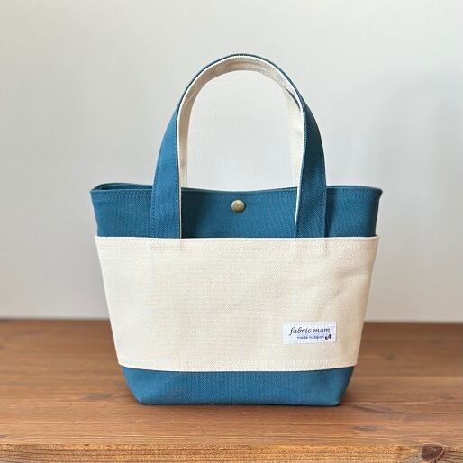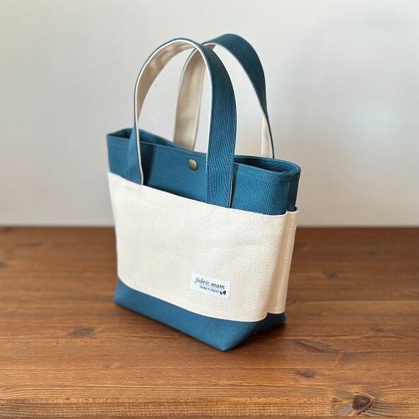 かっちりタイプのミネラルブルー色(066)8号帆布を本体に、生成り色8号帆布を外ポケット部分に使用したトートバッグです。