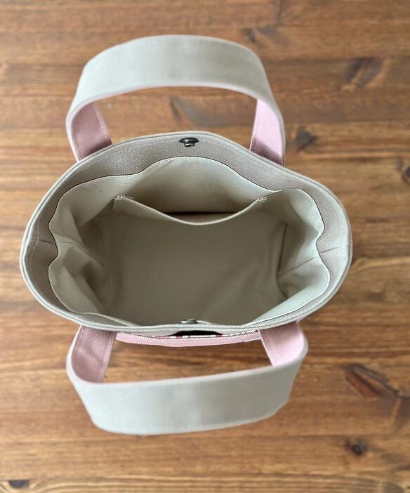 かっちりタイプのマッシュルーム色8号帆布を本体に、スモーキーコーラル色8号帆布を外ポケット部分に使用したトートバッグです。