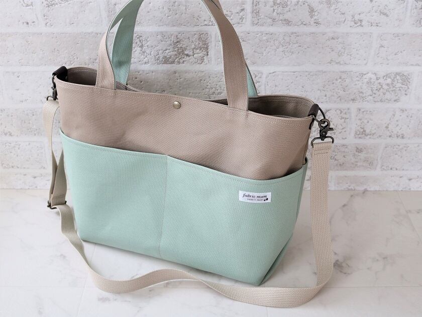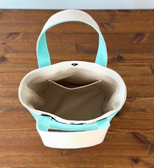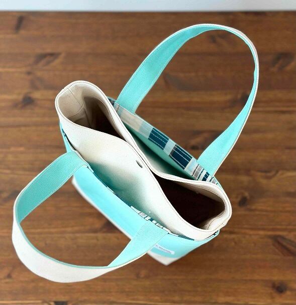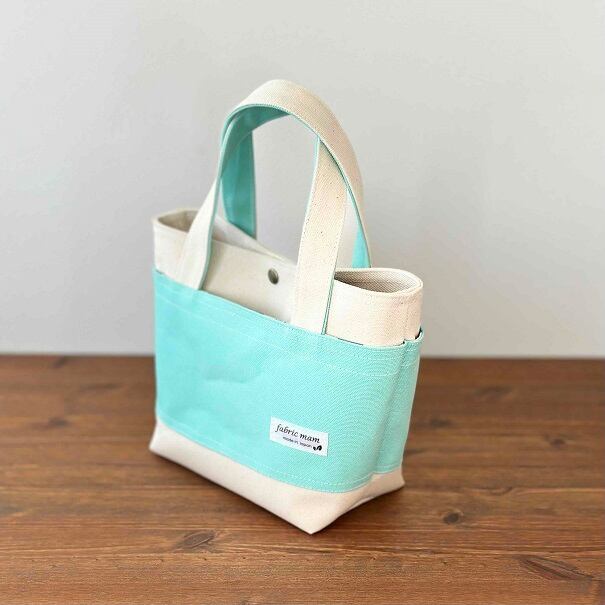 かっちりタイプの生成色8号帆布を本体に、ホライズン色8号帆布を外ポケット部分に使用したトートバッグです。