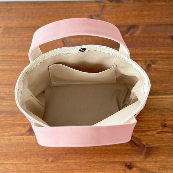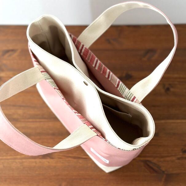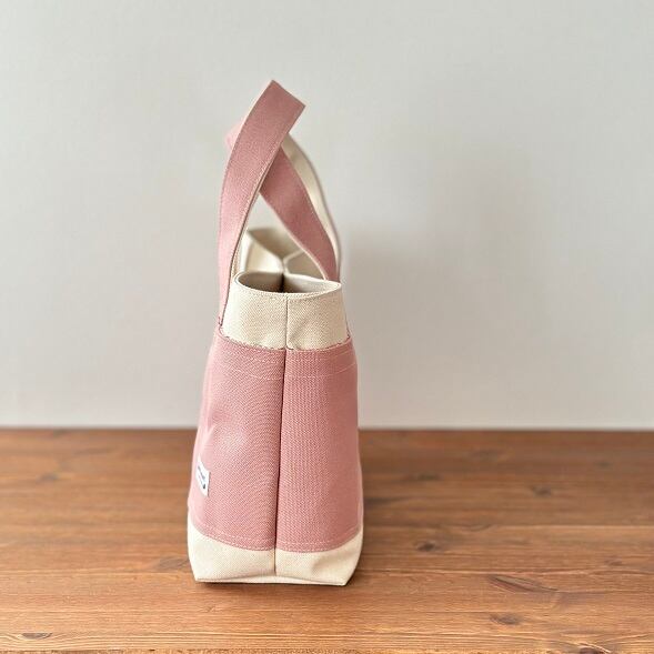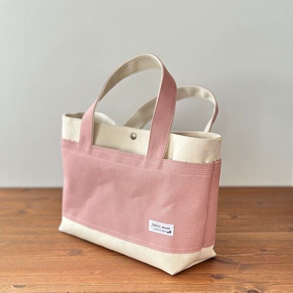▢かっちりタイプの生成色8号帆布を本体に、スモーキーコーラル色8号帆布を外ポケット部分に使用したトートバッグです。