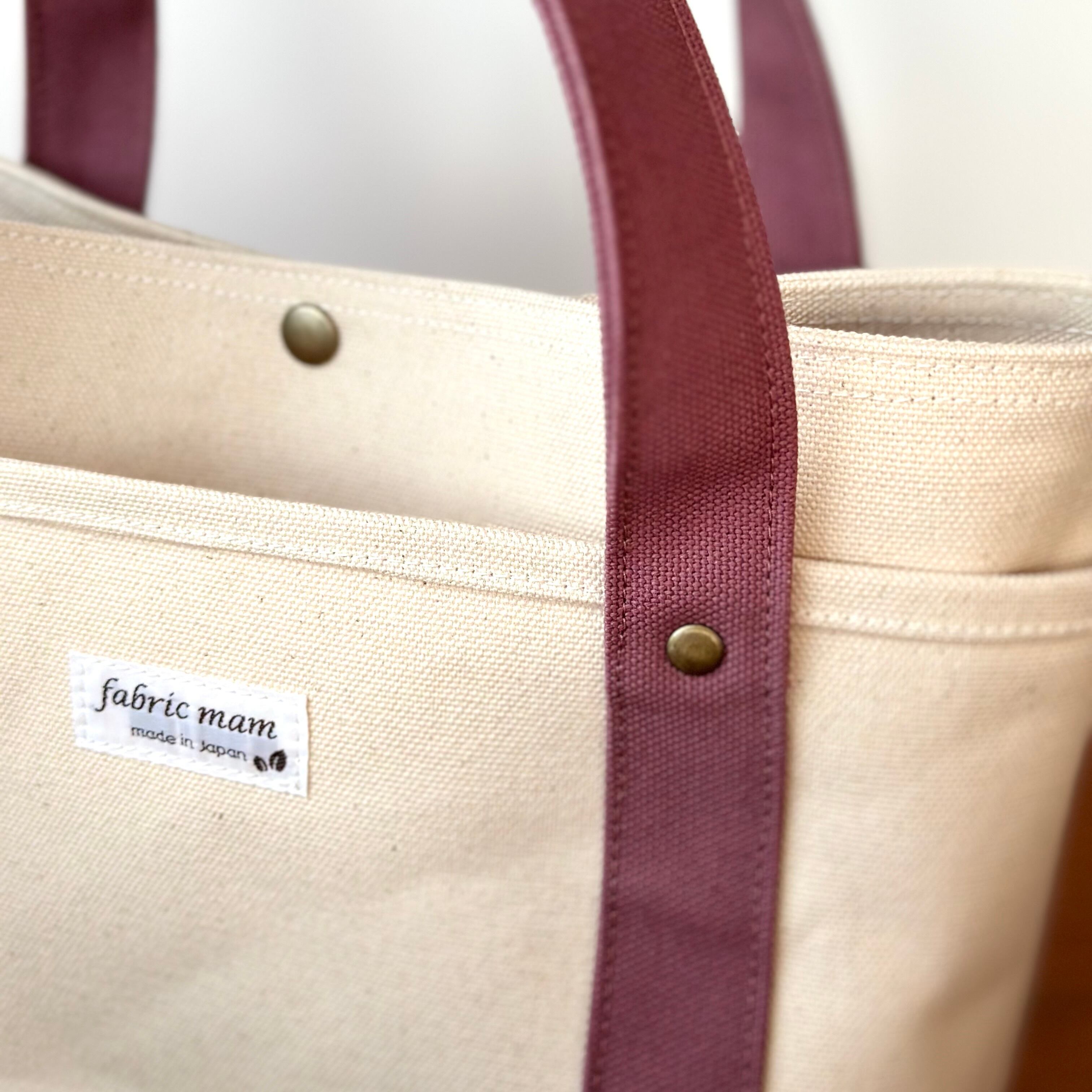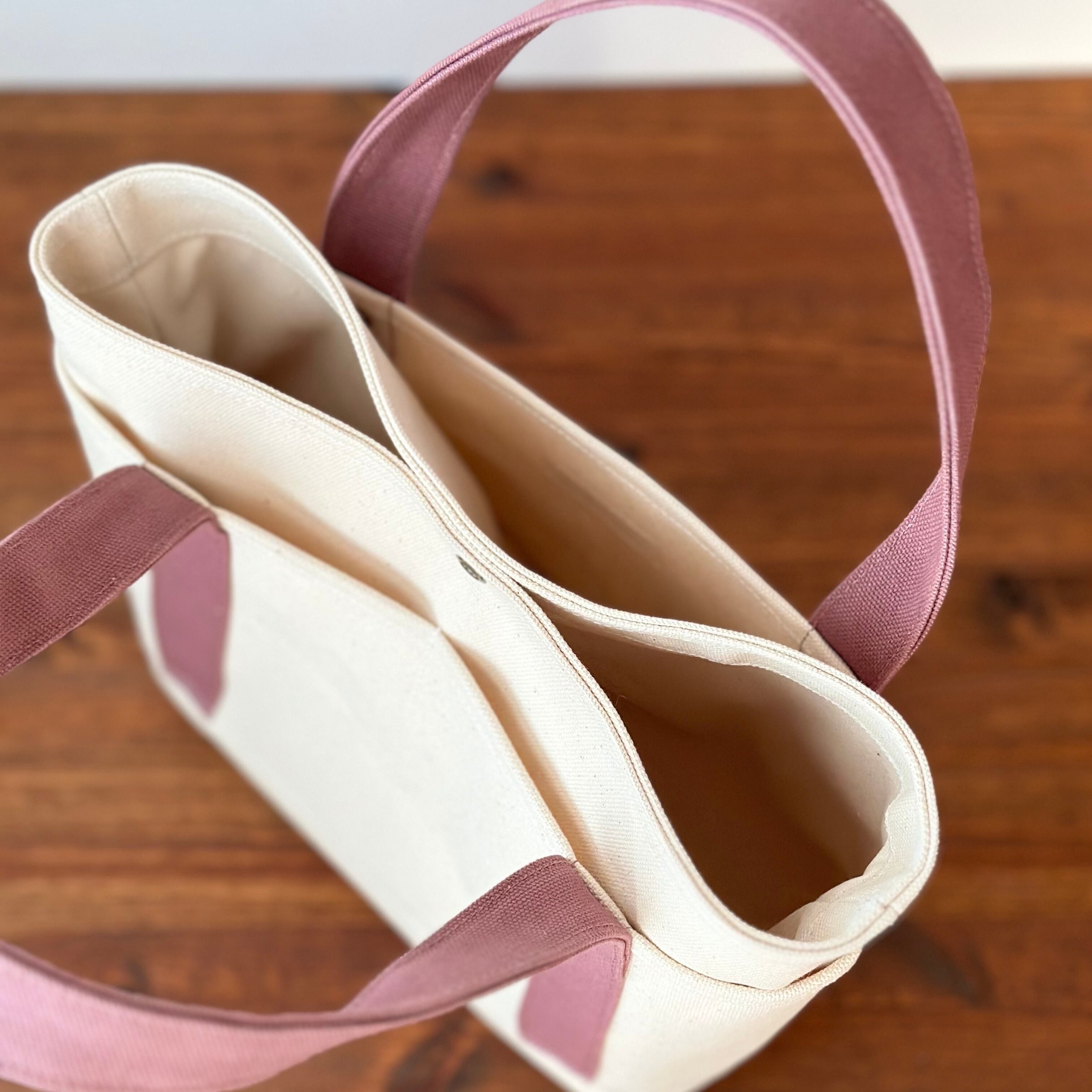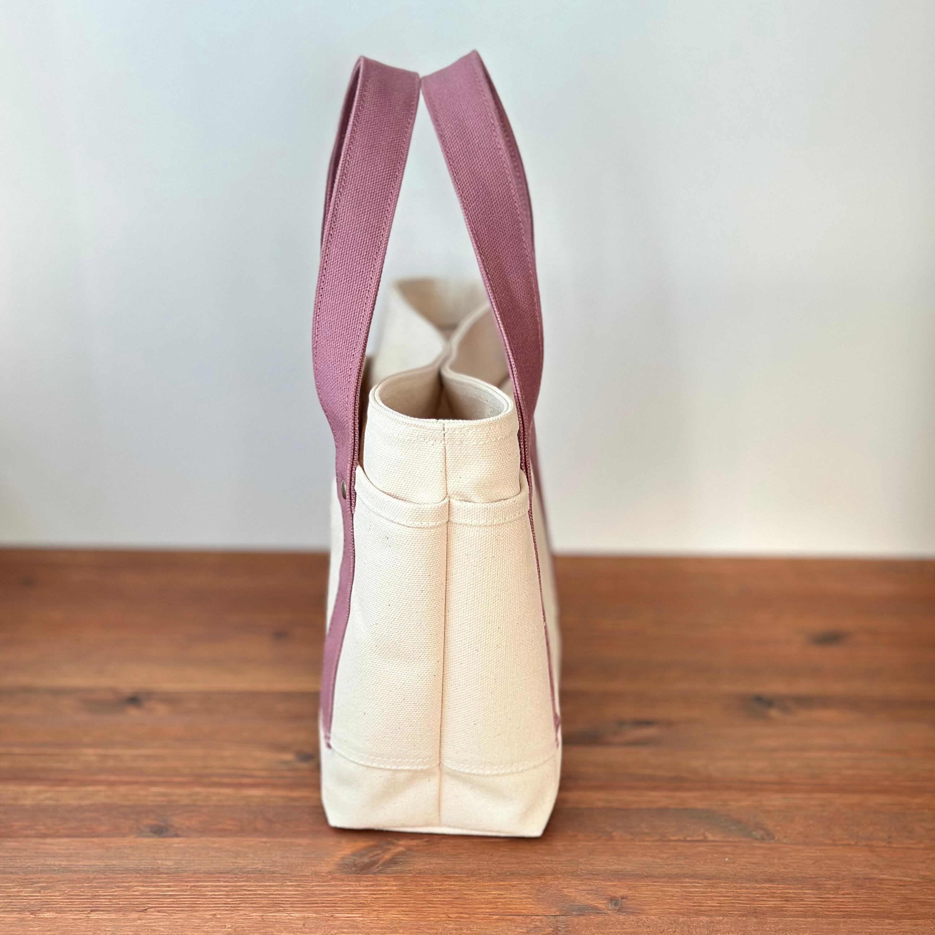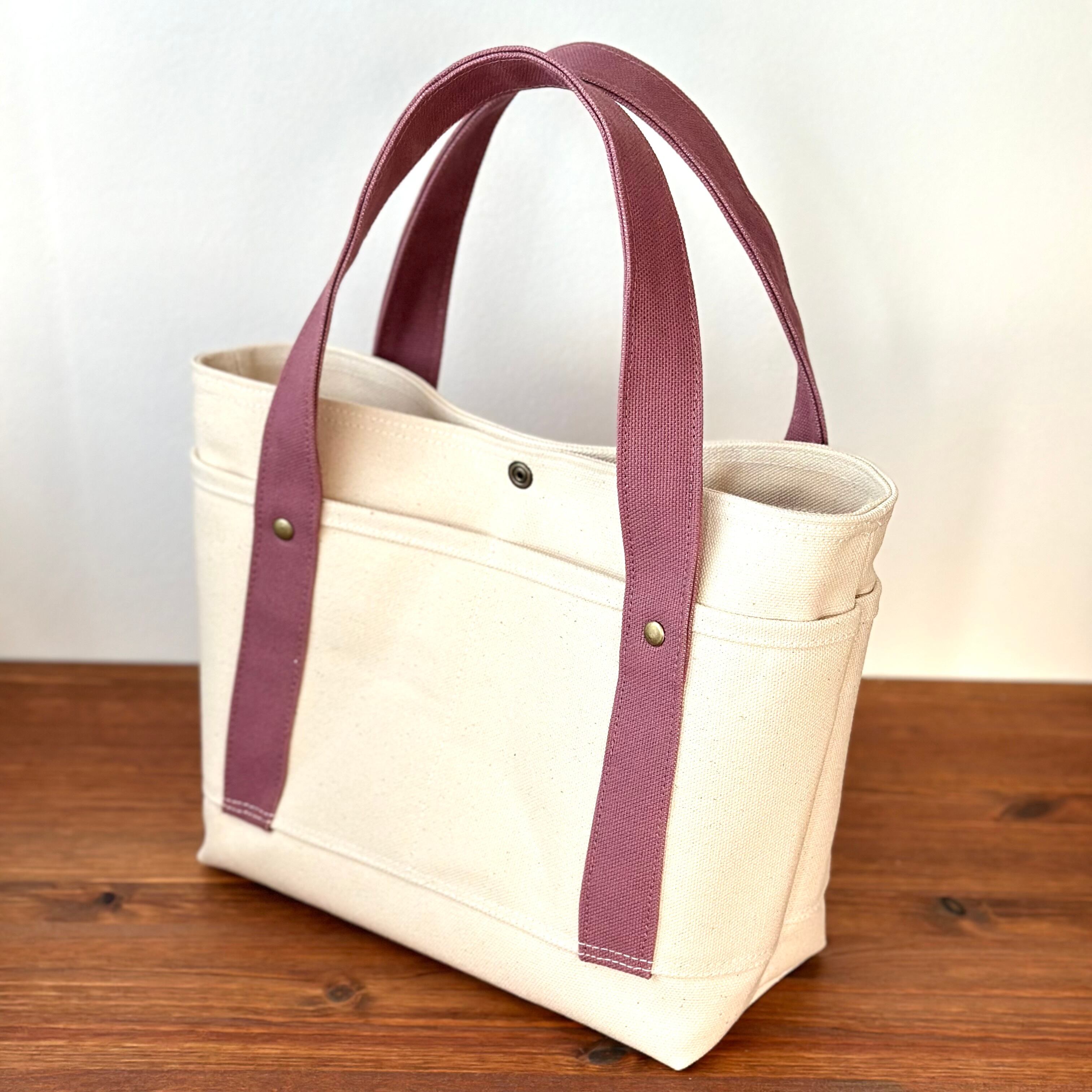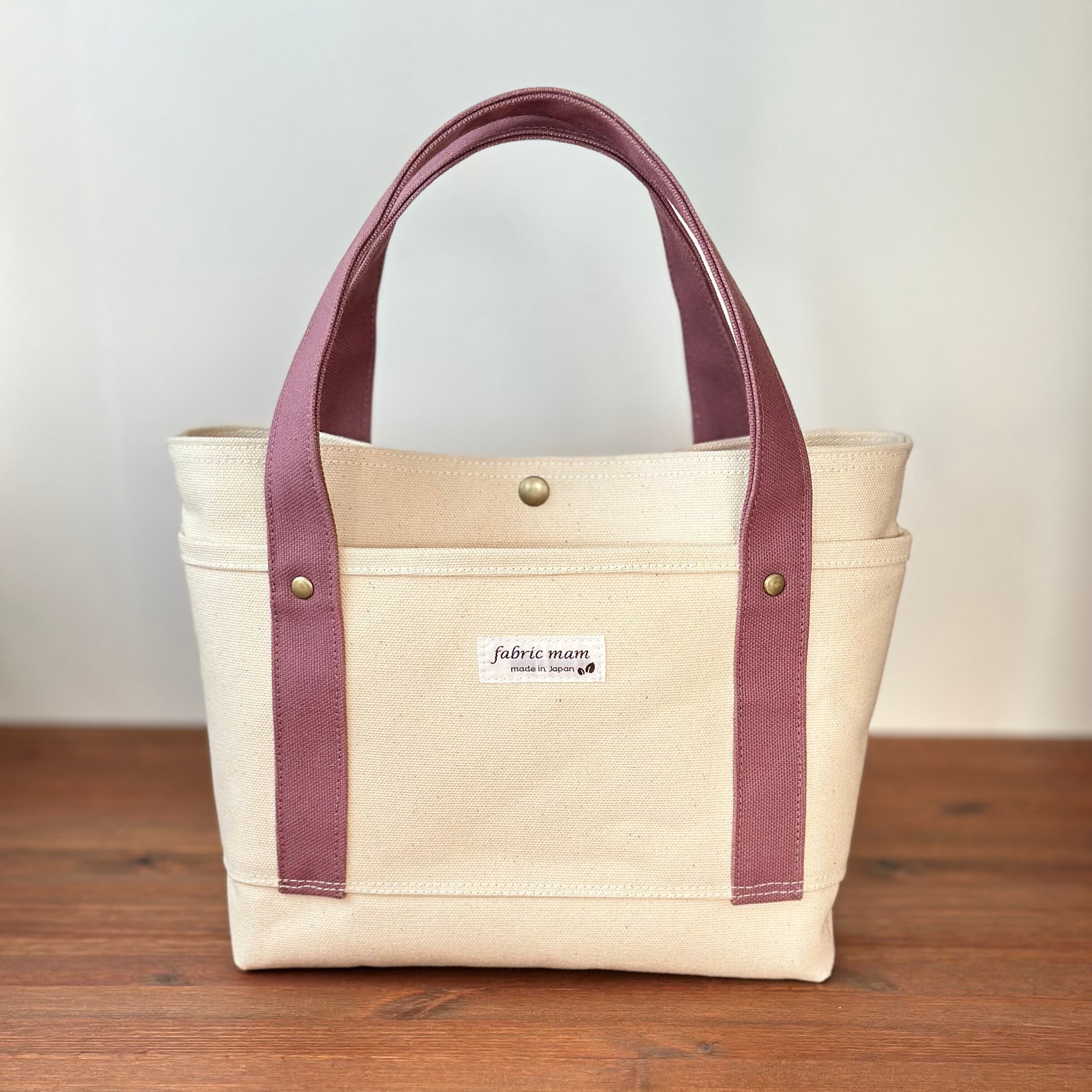 ▢軽量で丈夫な倉敷帆布素材を使用した可愛らしいSサイズトートバッグ。シンプルな生成りベースに持ち手の優しいプラム色がおしゃれで目を引きます。