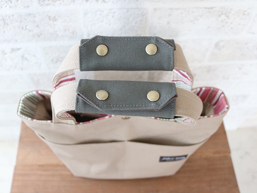 ▢市販では革製品としてよくお見かけいたしますが、どうせならばと当店のトートバッグにしっくりと馴染むように共布の8号しっかり帆布を使用しています。